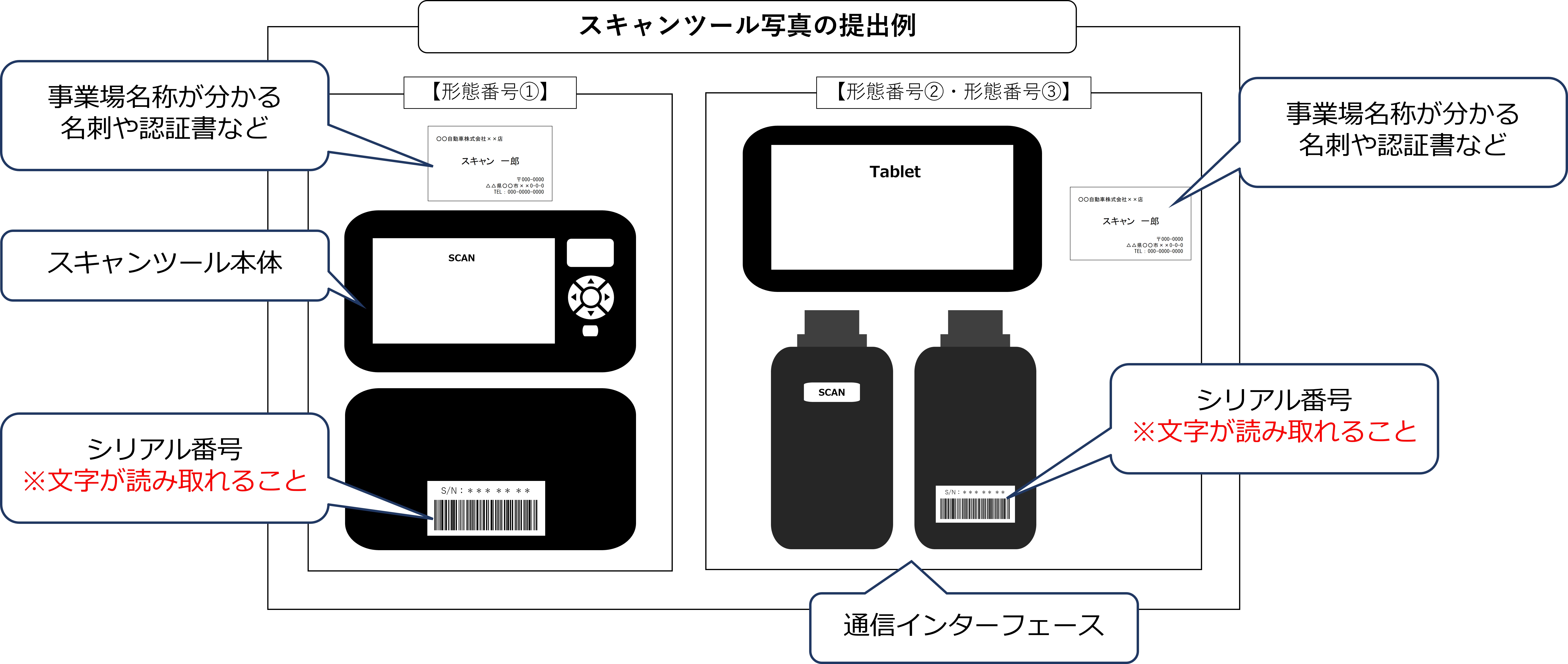 (1) 通信インターフェース、情報端末または故障診断用のソフトウェアの写真 (2) ⑴の取扱説明書や保証書等、スキャンツールを構成することが確認できる書類 ※ 現に保有している機器・ソフトウェアの購入費用以外のものの追加購入経費のみを 計上して申請をする場合 |